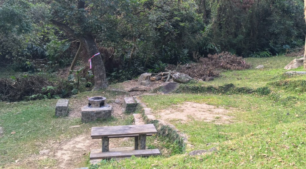 .A common setting for campsites in Hong Kong, Table and benches with fire pit, and a camping ground right next.