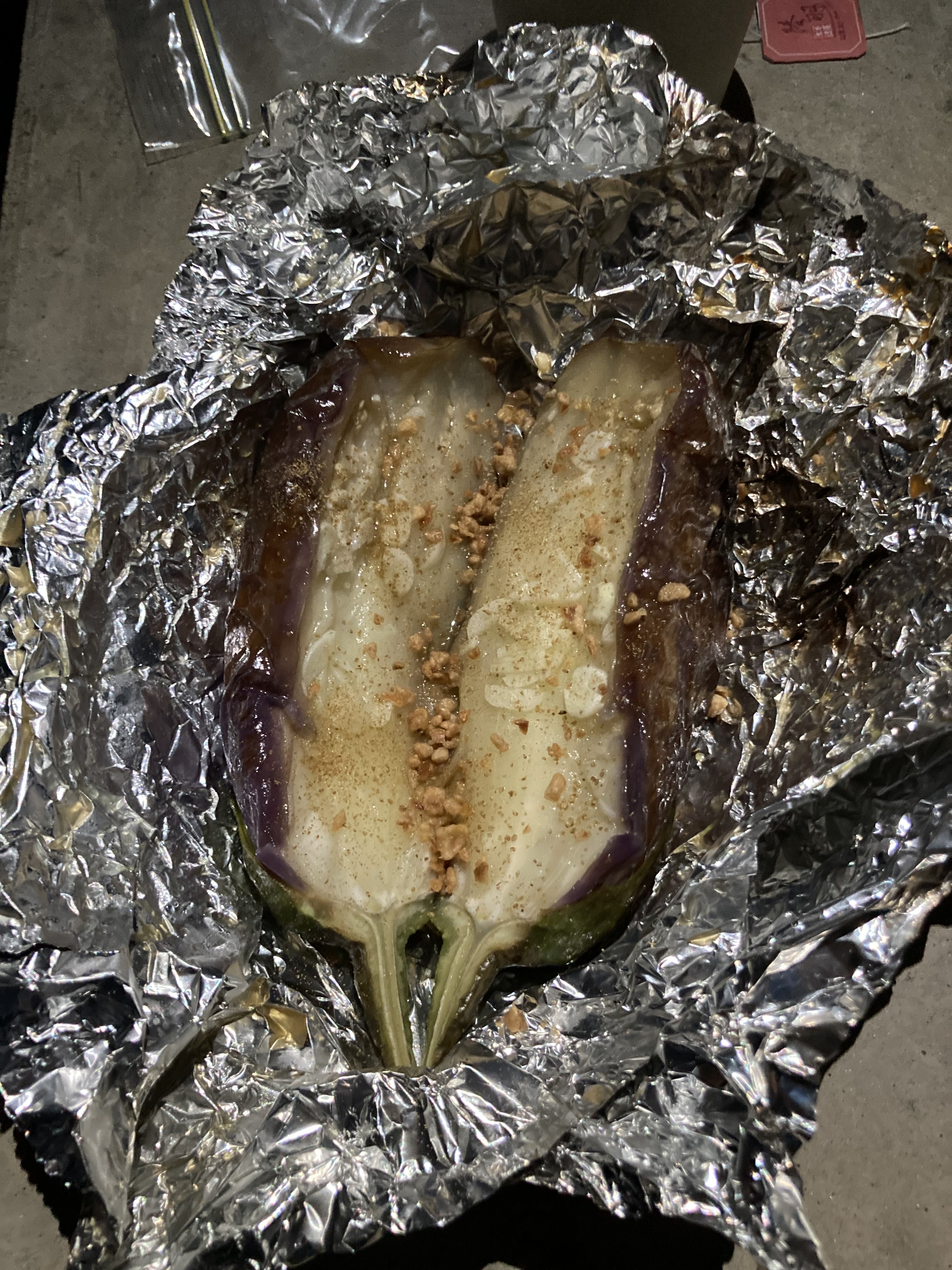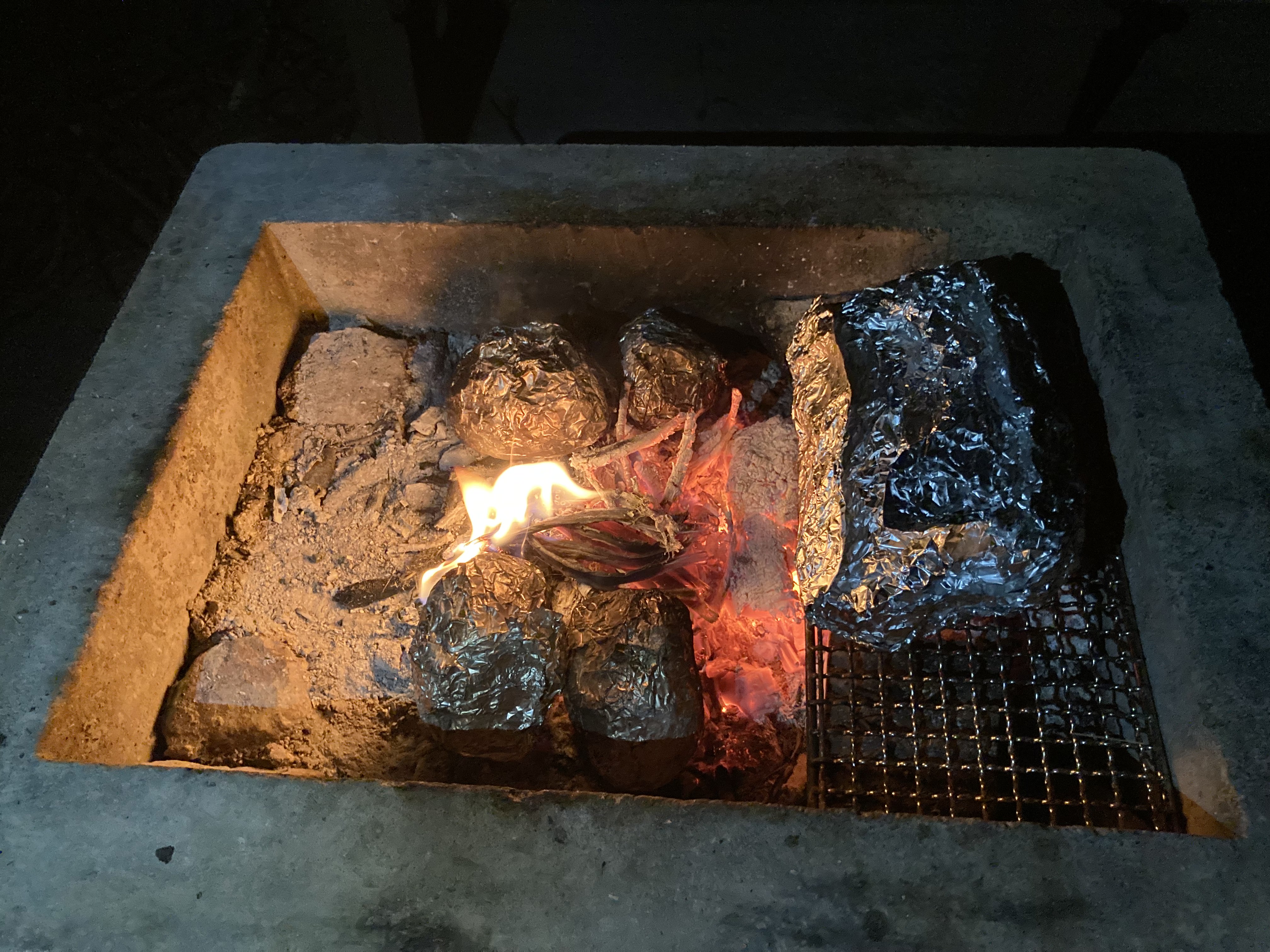 Late Dinner – Campfire baked eggplant, potato, shiitake mushrooms, jade melon and sausages with yoghurt