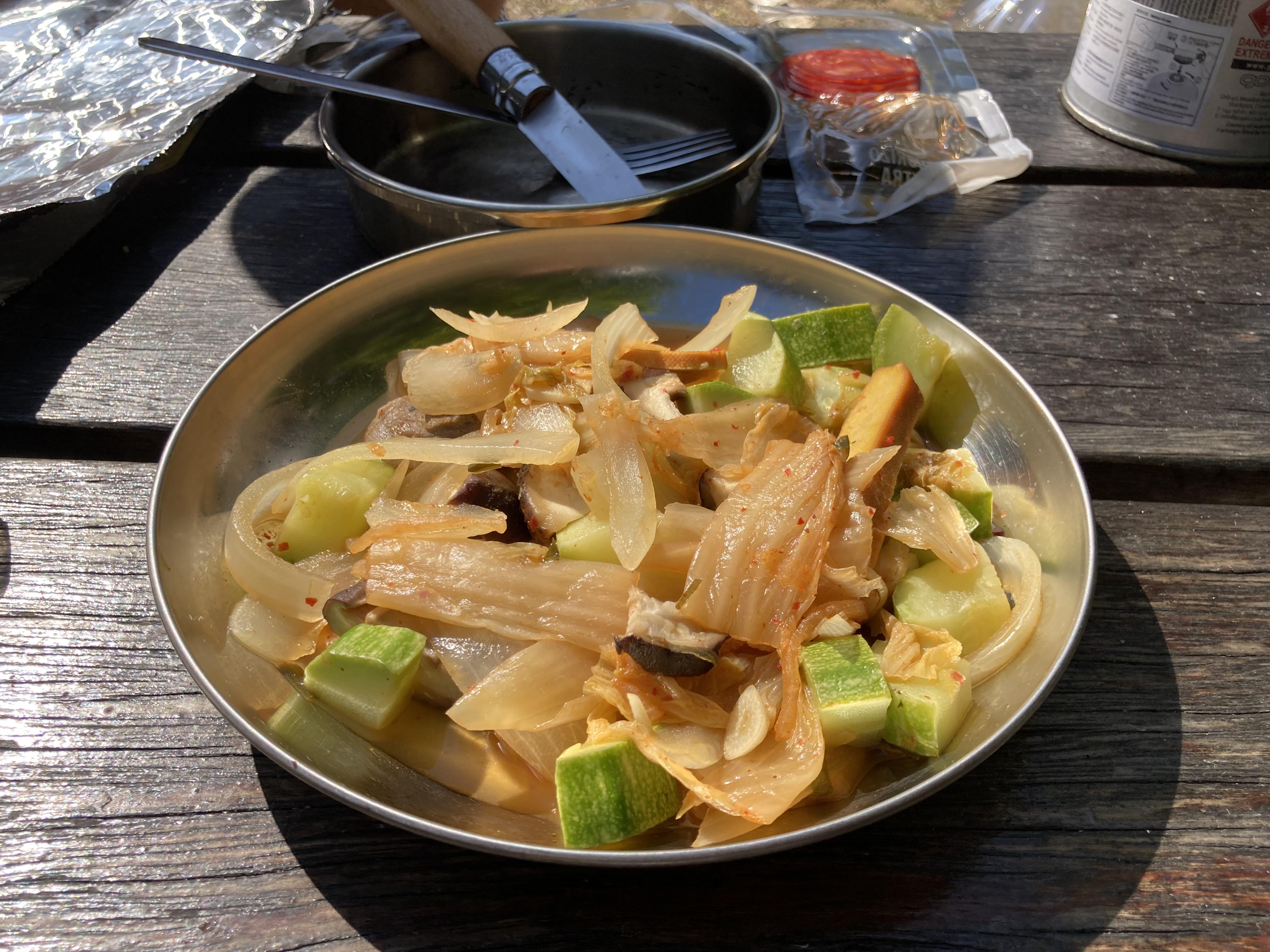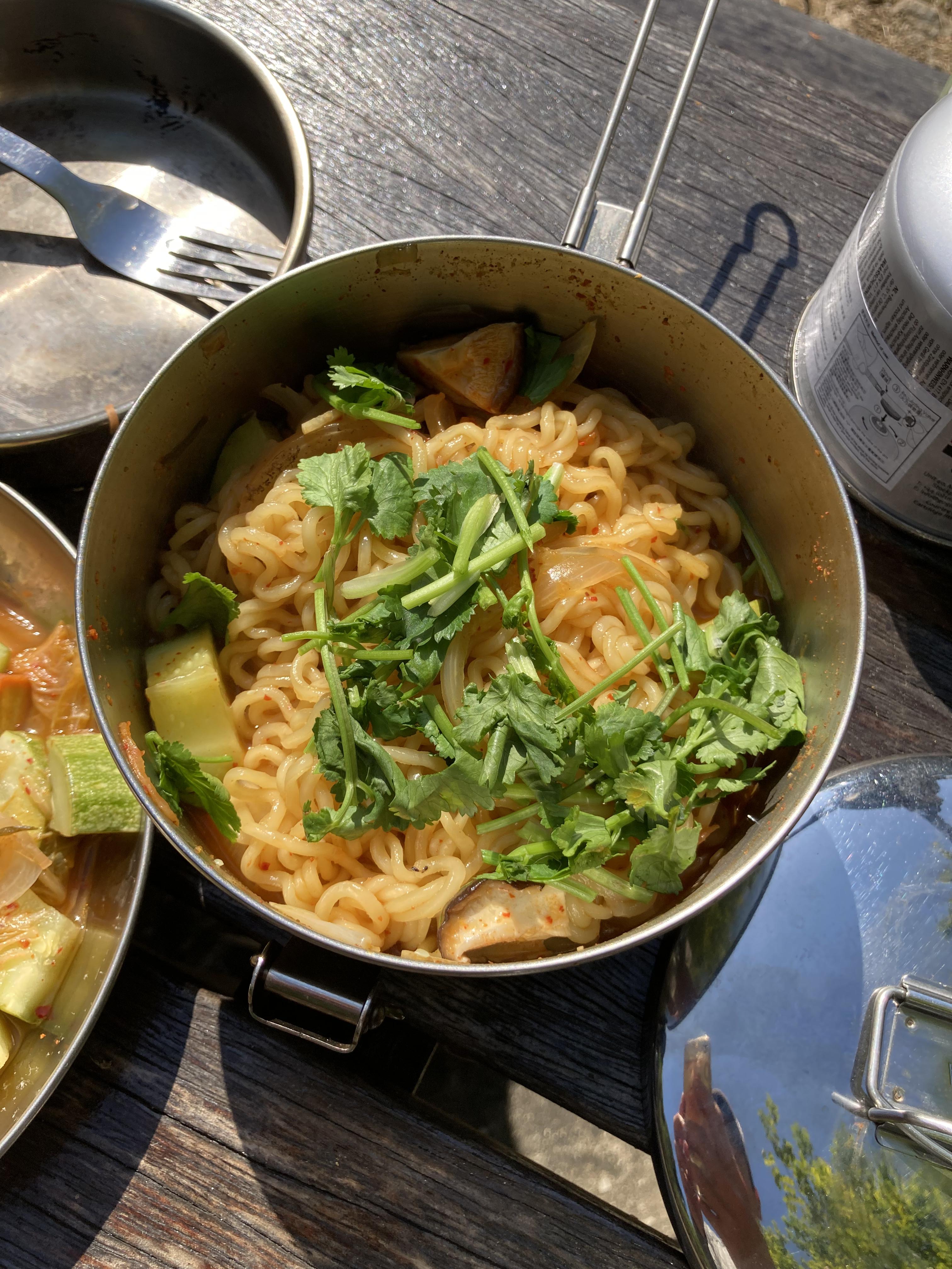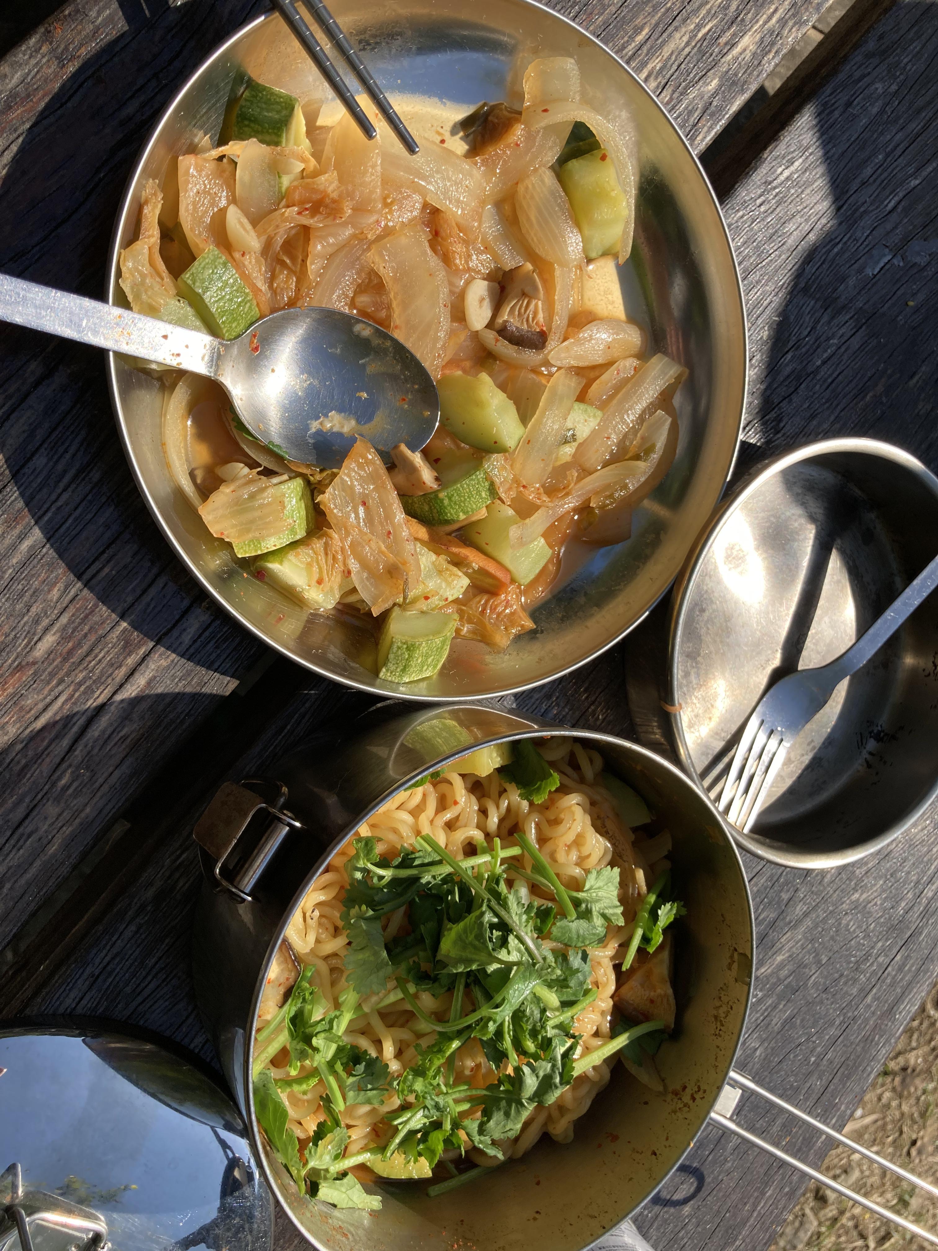 Morning: The next morning, I woke up to the crisp winter air and the promise of new adventures. For breakfast, I prepared a hearty meal of shin ramen with cabbage meatballs and kimchi. The warm, savory flavors were the perfect start to the day.